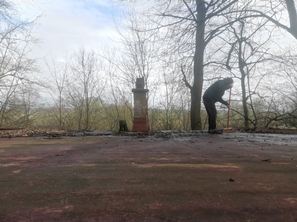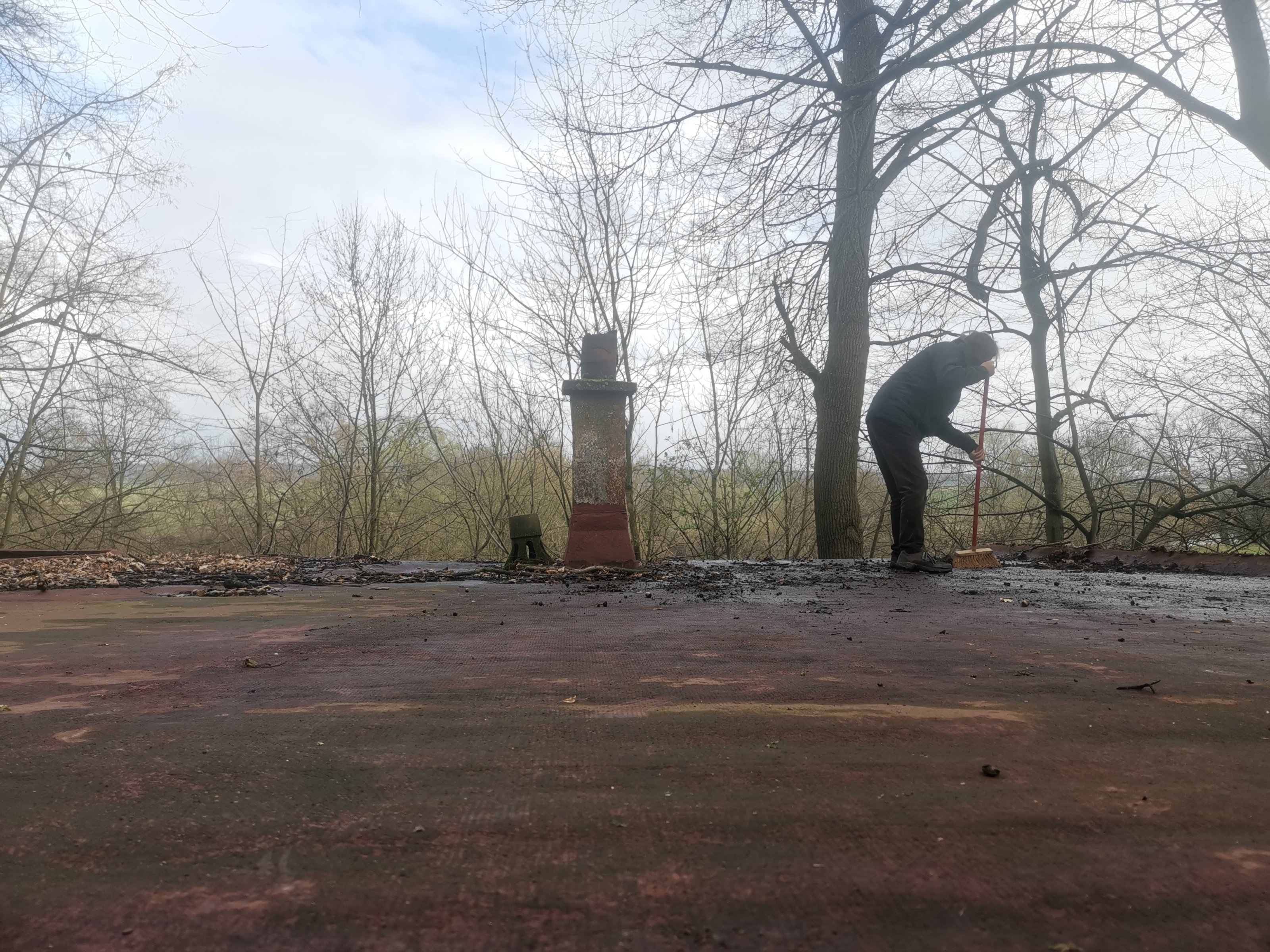 Druhý den se jdeme podívat na střechu, jak vlastně vypadá. Tedy nahoru leze jen JeD, já jen nakukuju z žebříku (nemám moc rád výšky). JeD i přes pokročilou kocovinu zatíná zuby a z chaty ometá napadaný bordel - listí, žaludy, větve a tak.