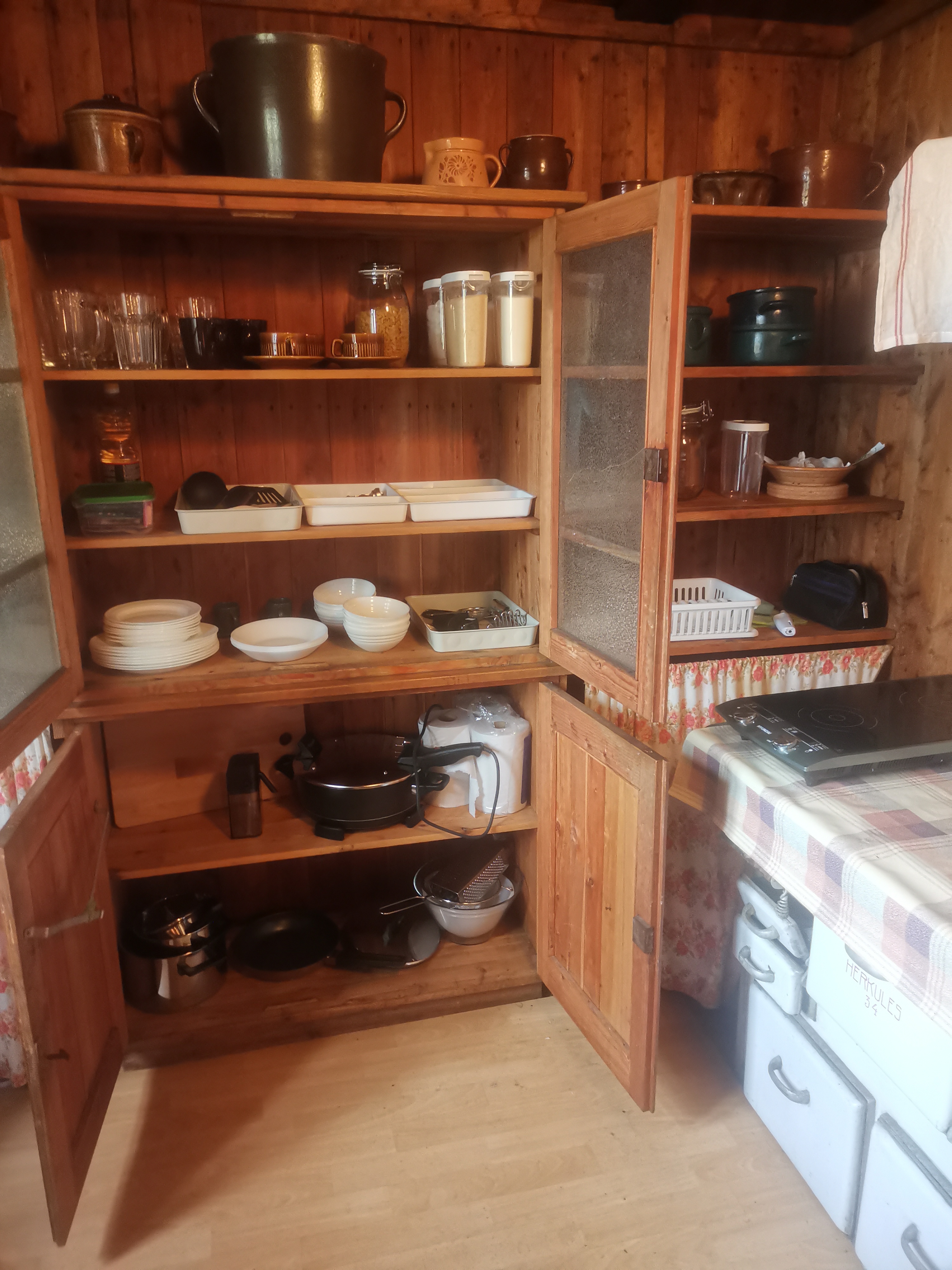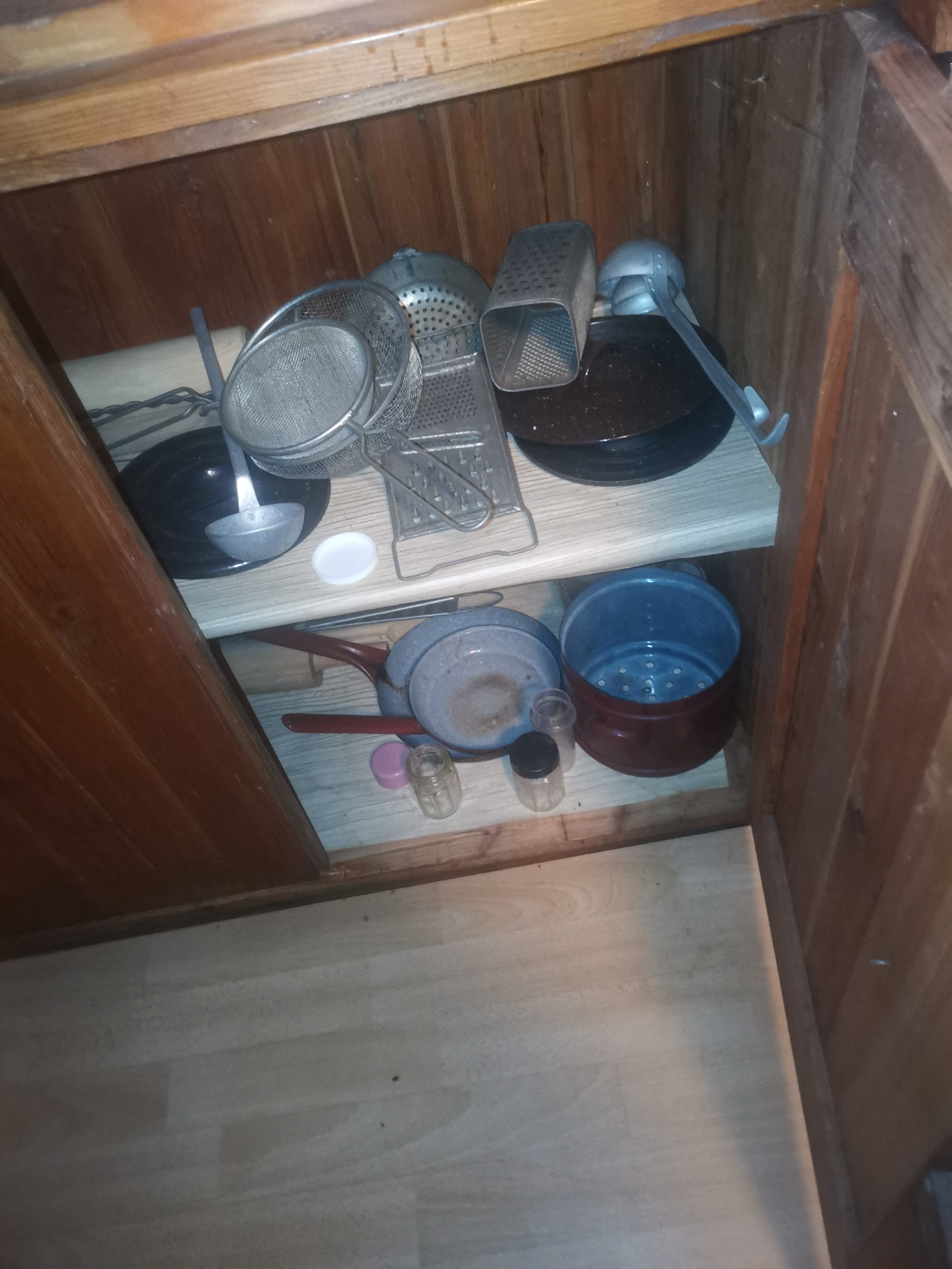 Poté, co JeD odjede, tak začínám s debordelizací kuchyně. Vyhazuji hromadu bordelu, starého nádobí, z polic sundavám tapety, kterými jsou oblepeny a čistím je. A umísťuji výbavu novou.