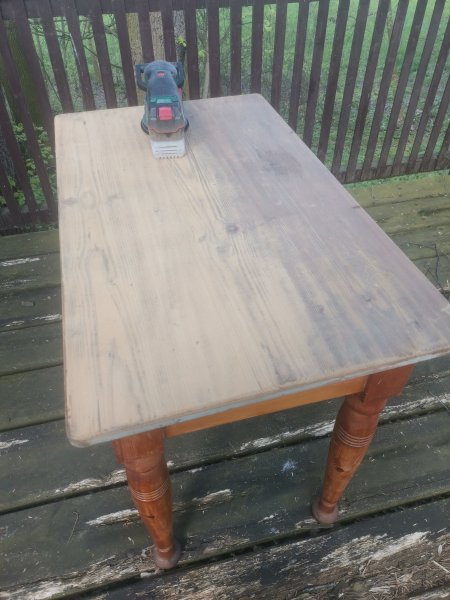 Potřebuju si udělat nějaké pracovní místo na počítač. Je tu starý stůl, přes který je igelitový ubrus. Po sundání ubrusu zjišťuju, že deska stolu je evidetně už měněná, taková poněkud zašedlá a ke stolu blbě přidělaná. Desku tedy přidělám pořádně a zbrousím. Po natření lněným olejem se hezky vybarví a trochu se sjednotí její odstín se zbytkem stolu. Řekl bych, že je to o chlup lepší, než igelit :-)