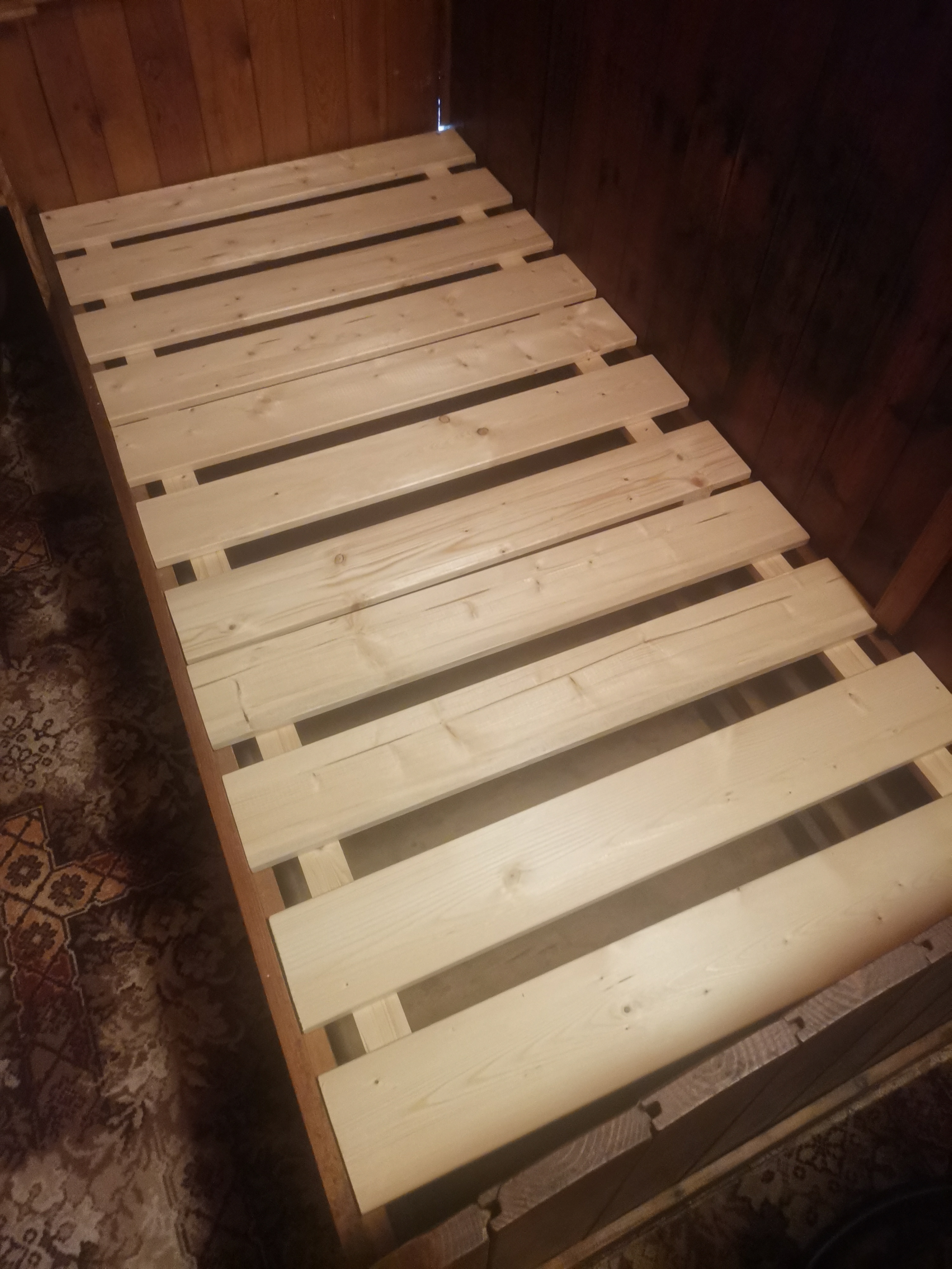 Pak potřebuji udělat rošty do postelí v zadním pokoji. Úplně tam chyběj a doposud tam pod starými matracemi byly takové staré drátěnky, prostě dost hrůza. Rošty dělám dělené na tři části, ať se dá pohodlně dostat k úložnému prostoru. Myslím, že budou dostatečně pevné i pro tlusťochy :-)