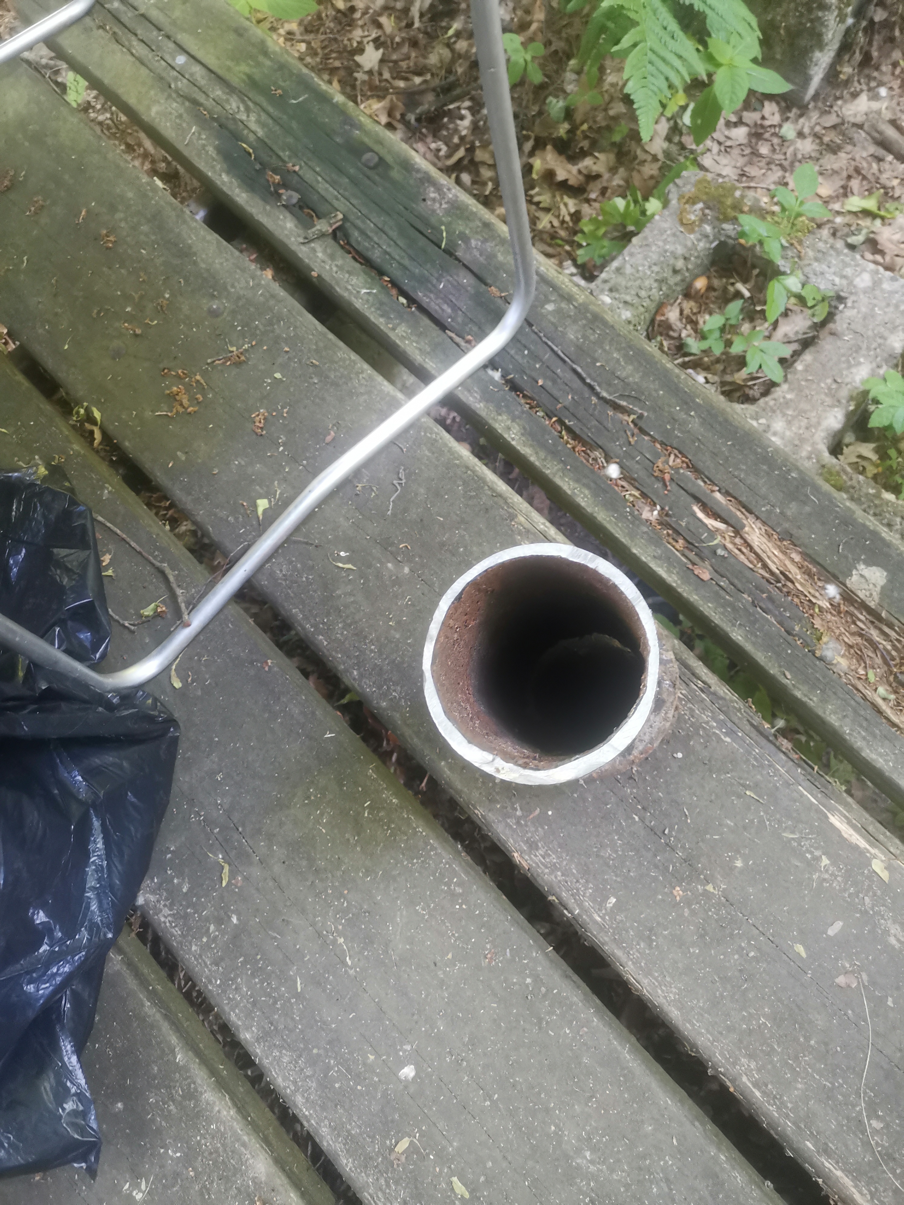 Beru flexu a jdu řezat. Po naříznutí trubky zkrz z ní začne vytékat obsah, který jsem takhle vysoko nečekal. Takže už neležím pouze v prachu a špíně, ale tak trochu i ve sračkách. Ok, jdu řezat výš. Jde to dost pomalu, ta trubka má stěny silné 10mm (jak později změřím) a tak u flexy ubývají rychleji kotoučky, než materiál té trubky. Ve chvlíli, kdy jsem zhruba ve třetině řezání (a několik kotoučků je fuč), tak zjišťuji, že jak je ta trubka blízko zdi, tak se dál flexou už prostě nedostanu, není tam dostatek místa. Po chvíli přemýšlení, jak pokračovat, vyrážím do Hornbachu koupit pilku na železo a zásobů listů do ní.
