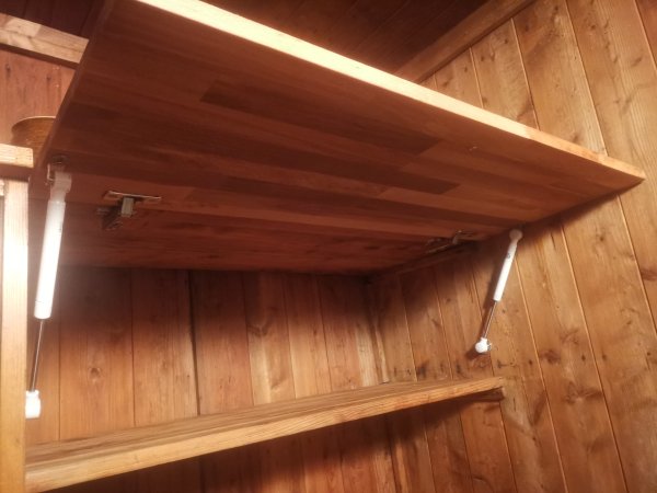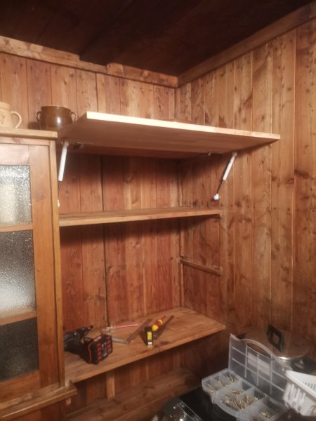 Mým cílem je vlevo dole udělat na výšku dvou polic skříňku a nahoře vlevo i vpravo udělat skříňku na výšku jedné police, s otvíráním nahoru. Trochu problém je, že vlevo nahoře jsou ty police strašně křivé. Takto vypadá vodováha, když je rovně (a to o polici níže je to ještě křivější):
