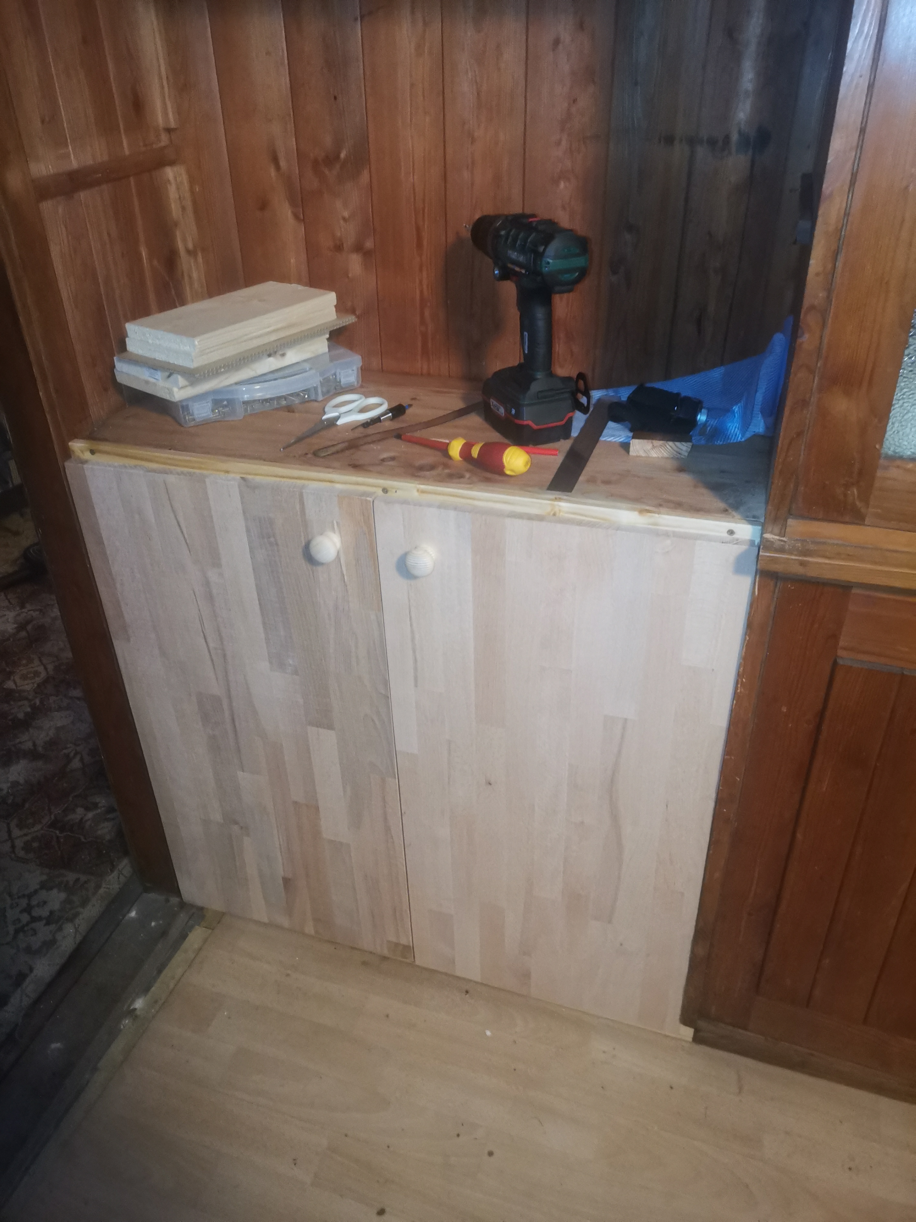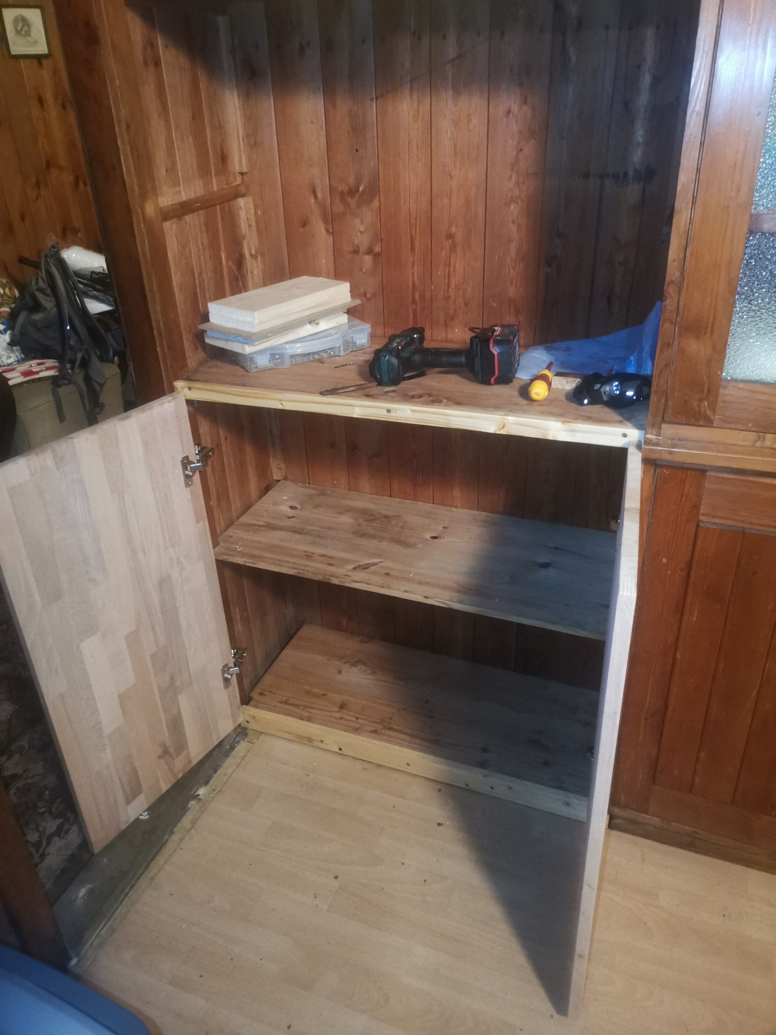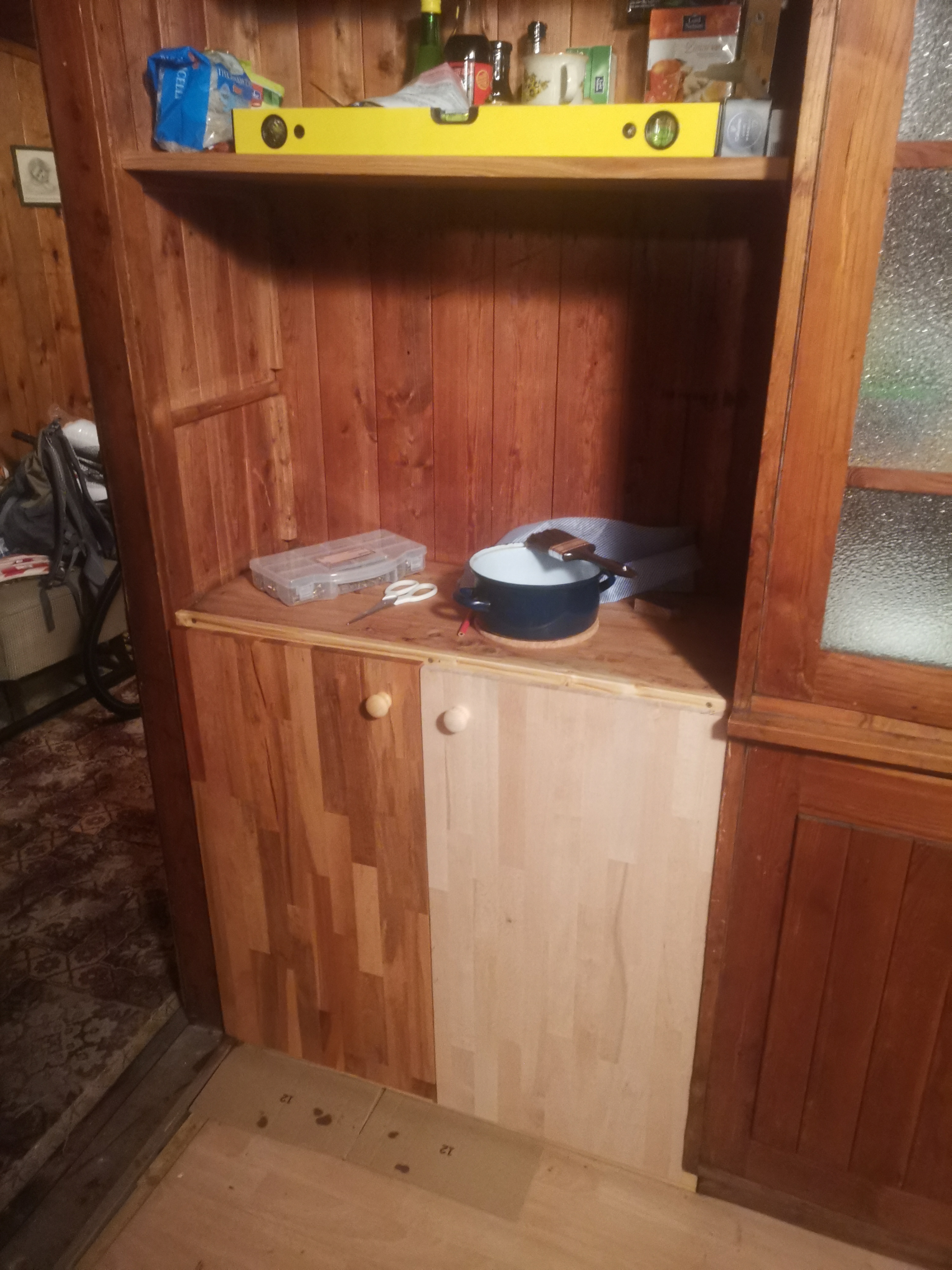 Takže nakonec se rozhoduju udělat nahoře tu skříňku jen v pravé části, kde je to relativně rovně. Materiál mám nakoupený a jdu se do toho pustit. Z jedné zbylé police (nahoře jí neptřebuji) udělám podlahu a pak je potřeba udělat ve spodní a horní části skříňky lišty. Navíc je potřeba odřezat přečnívající roh u té prosklené skříňky vpravo dole. A pak už pokračuju dvířky. Dílnu jsem si udělal venku, ať nemám chatu plnou pilin. A jde to docela dobře, na to, že jsem to nikdy nedělal, naštěstí se dnes dá všechno vygooglit :-)