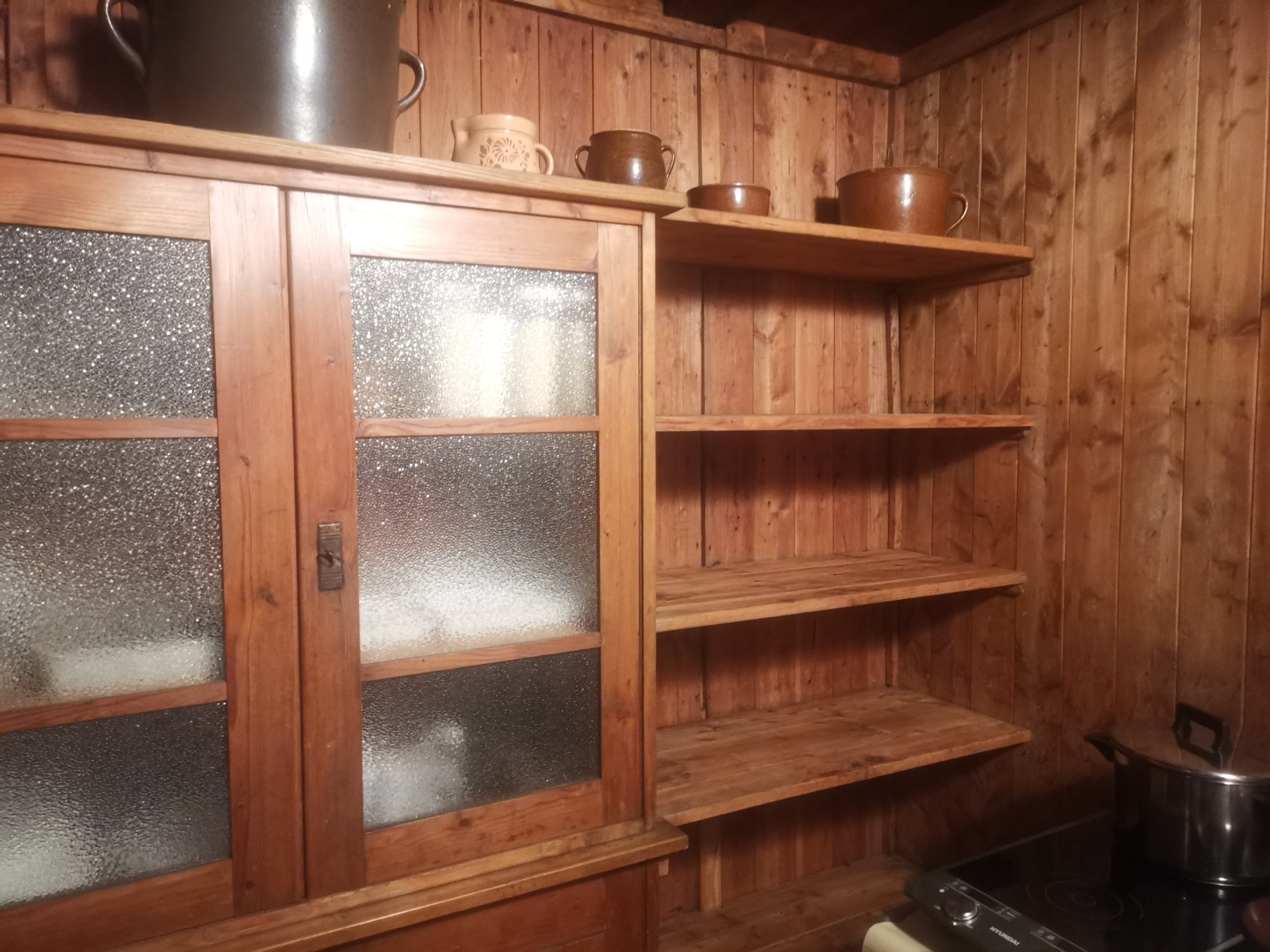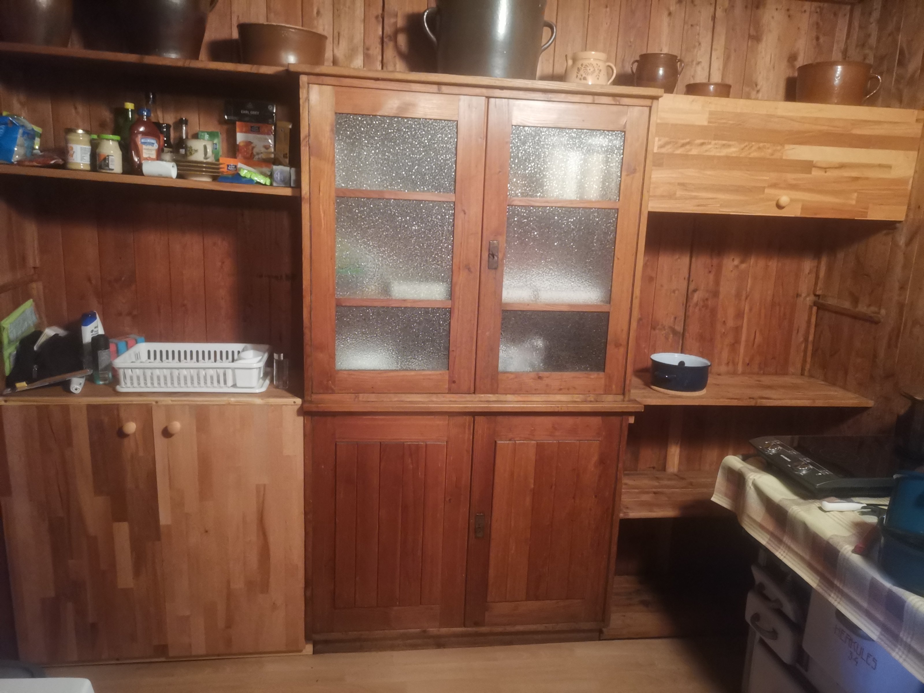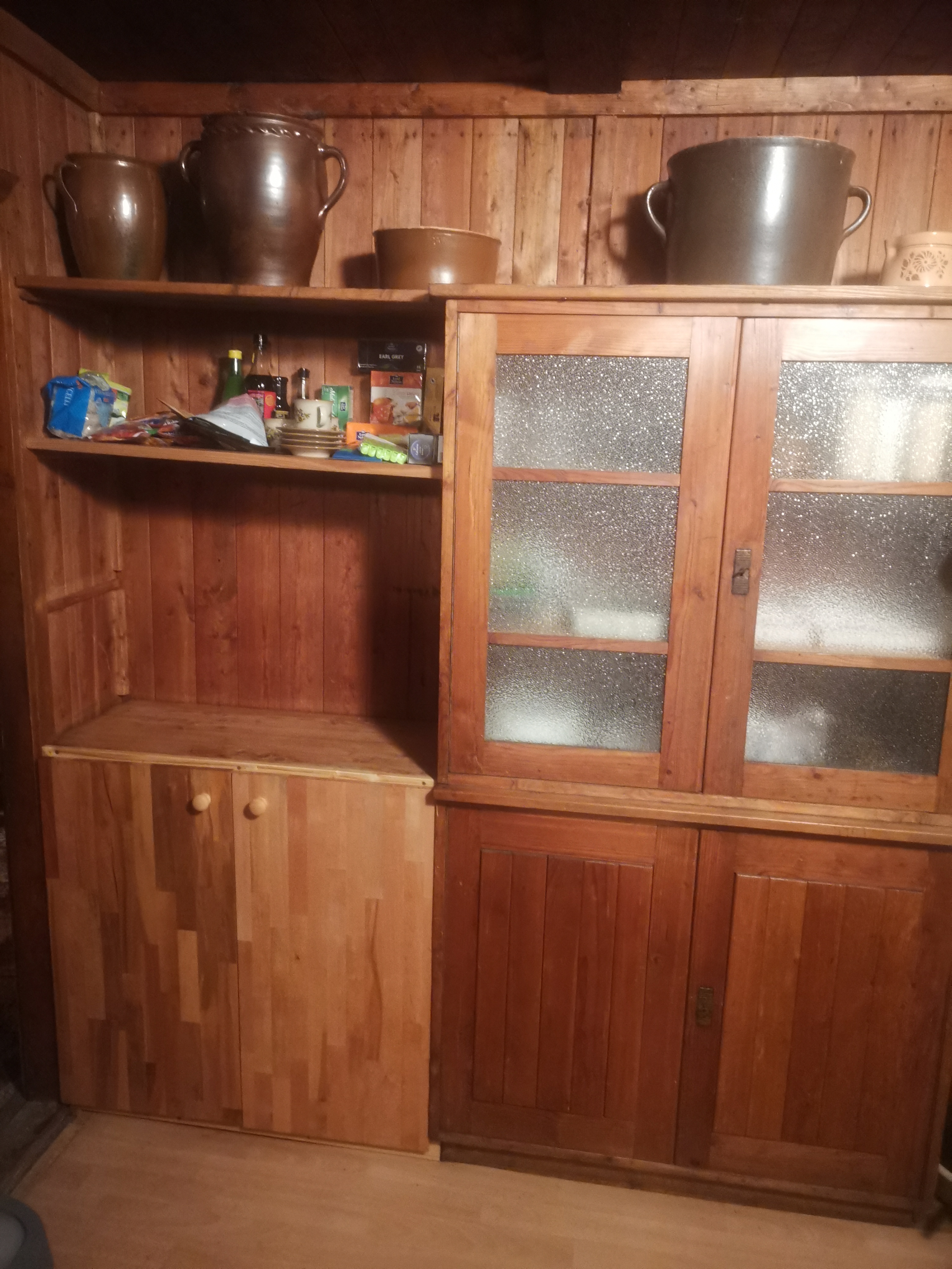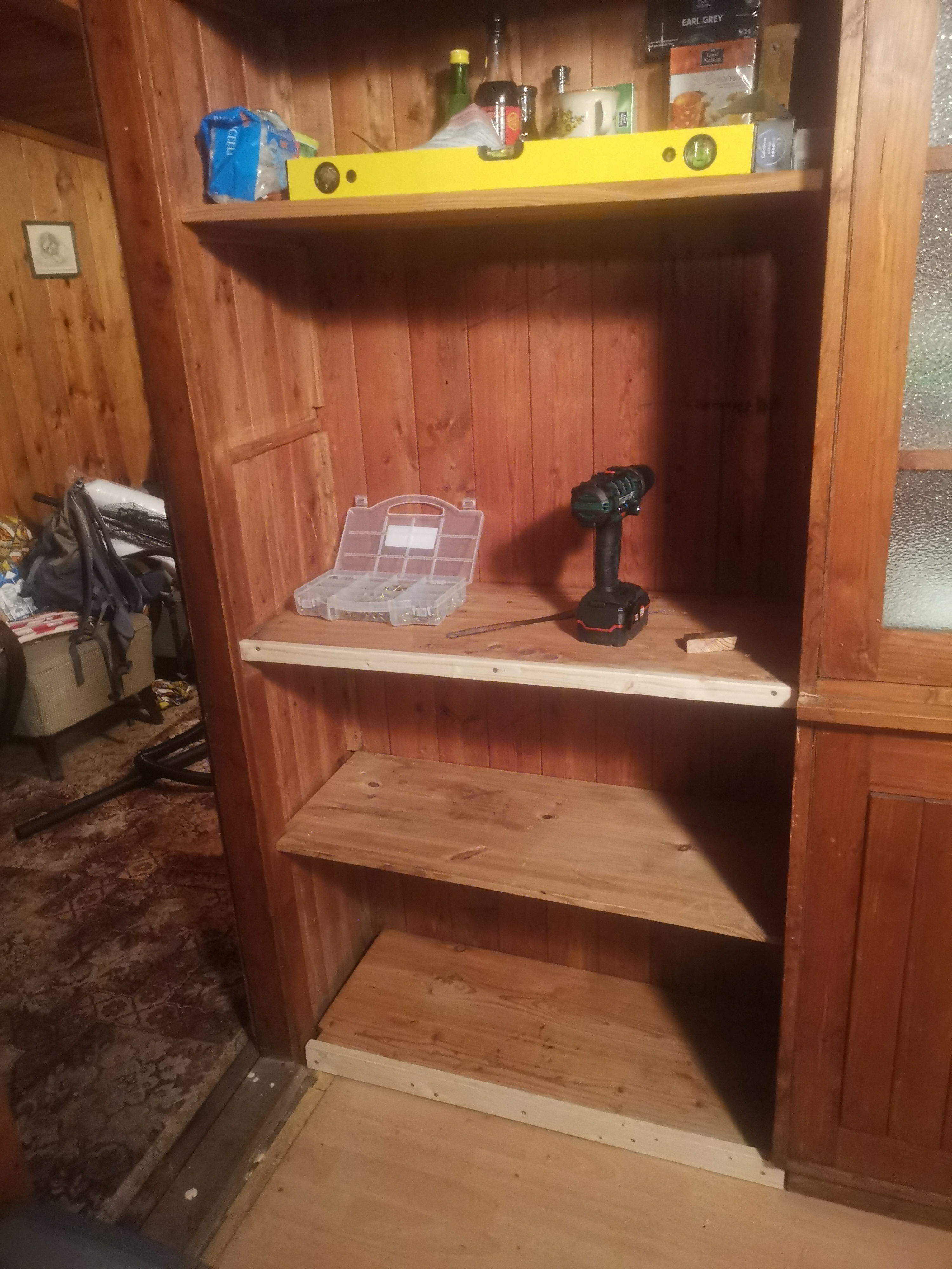 Takže nakonec se rozhoduju udělat nahoře tu skříňku jen v pravé části, kde je to relativně rovně. Materiál mám nakoupený a jdu se do toho pustit. Z jedné zbylé police (nahoře jí neptřebuji) udělám podlahu a pak je potřeba udělat ve spodní a horní části skříňky lišty. Navíc je potřeba odřezat přečnívající roh u té prosklené skříňky vpravo dole. A pak už pokračuju dvířky. Dílnu jsem si udělal venku, ať nemám chatu plnou pilin. A jde to docela dobře, na to, že jsem to nikdy nedělal, naštěstí se dnes dá všechno vygooglit :-)