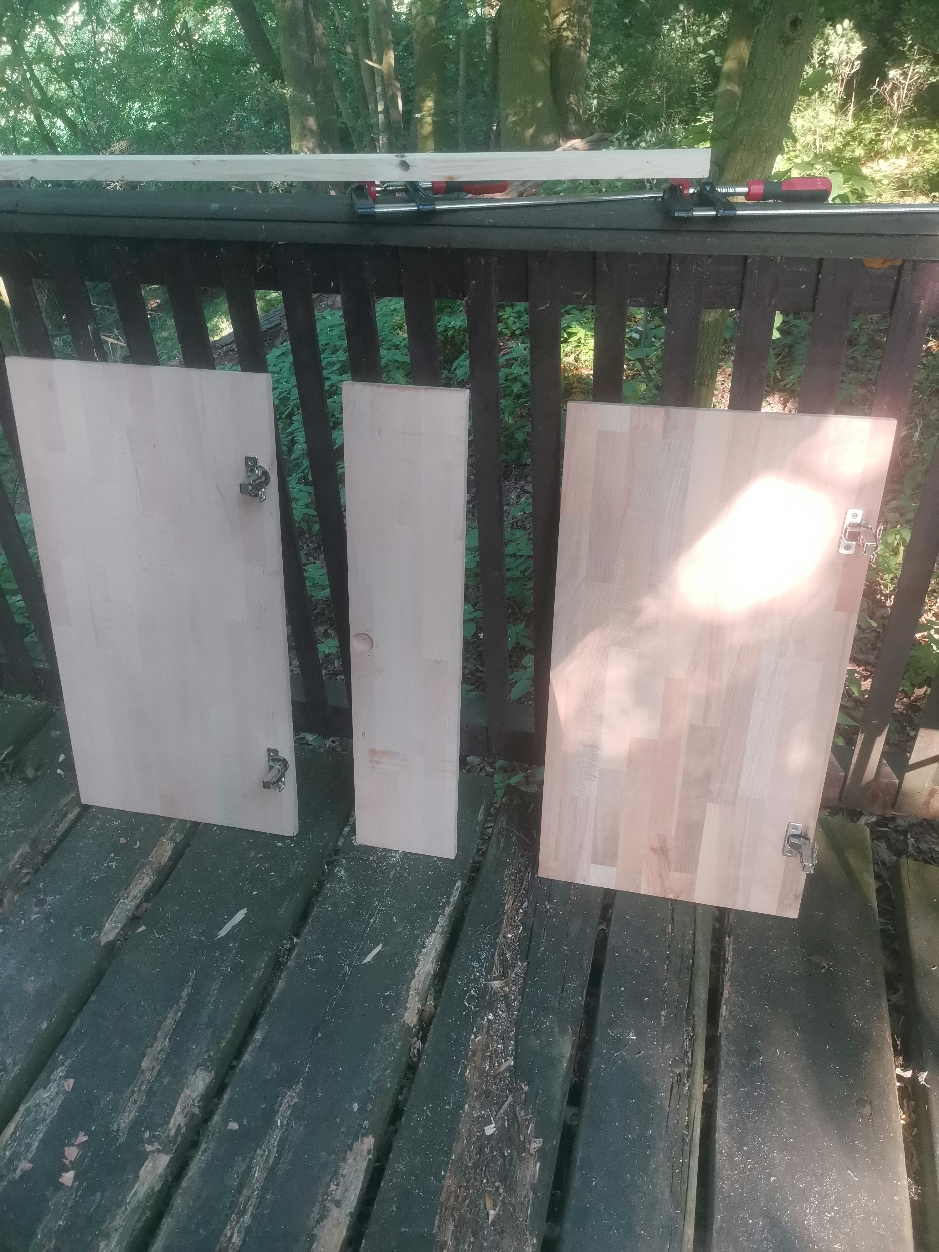 Dvířka dělám z bukové sprárovky, mám v plánu jen ošetřit lněným olejem, protože už jsem ho před časem na něco použil a líbí se mi, jak je to jednoduché a přitom to hezky zvýrazní barvu dřeva. U toho buku je to zvýraznění ale ještě lepší, než jsem čekal. Schválně jsem udělal fotku, kde je tím olejem ošetřena teprve půlka, takže je ten rozdíl hezky vidět :)